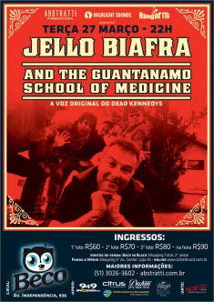 No mesmo dia que Iced Earth toca no Opinião, Jello Biafra (ex-Dead Kennedys) And The Guantanamo School of Medicine tocam no Beco. Os ingressos custam entre R$60 e R$90 e também não há divisão por setor,apenas por lote.Podem ser adquiridos online ou nas lojas Panda & Monio e Back in Black. Mais informações no site da Abstratti